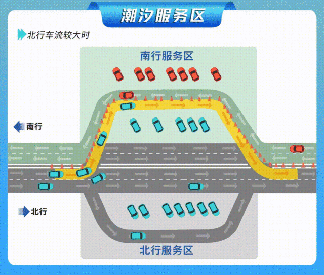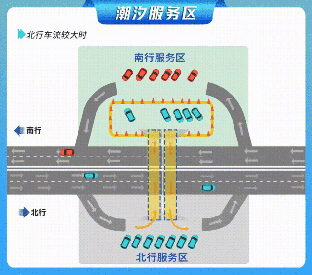 潮汐服务区模式:车辆在引导下借用对向车道进入对向服务区。